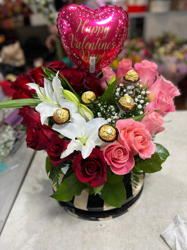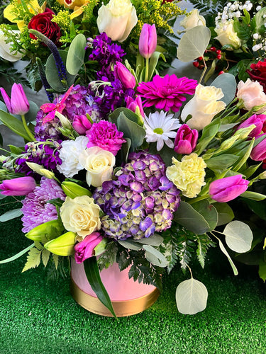 Pink arrangement in box